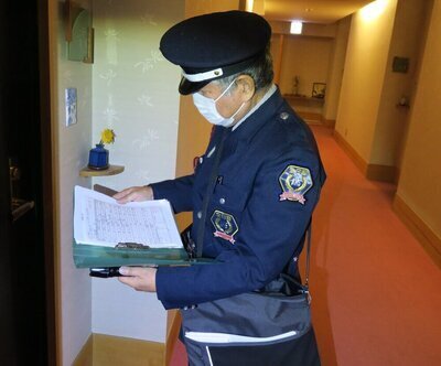 県内有名温泉旅館での夜間警備。 施設を巡回し異常がないか確認します。 また電話応対や温泉設備の数値チェック、施錠の確認など宿泊施設施設ならではの警備も行います。