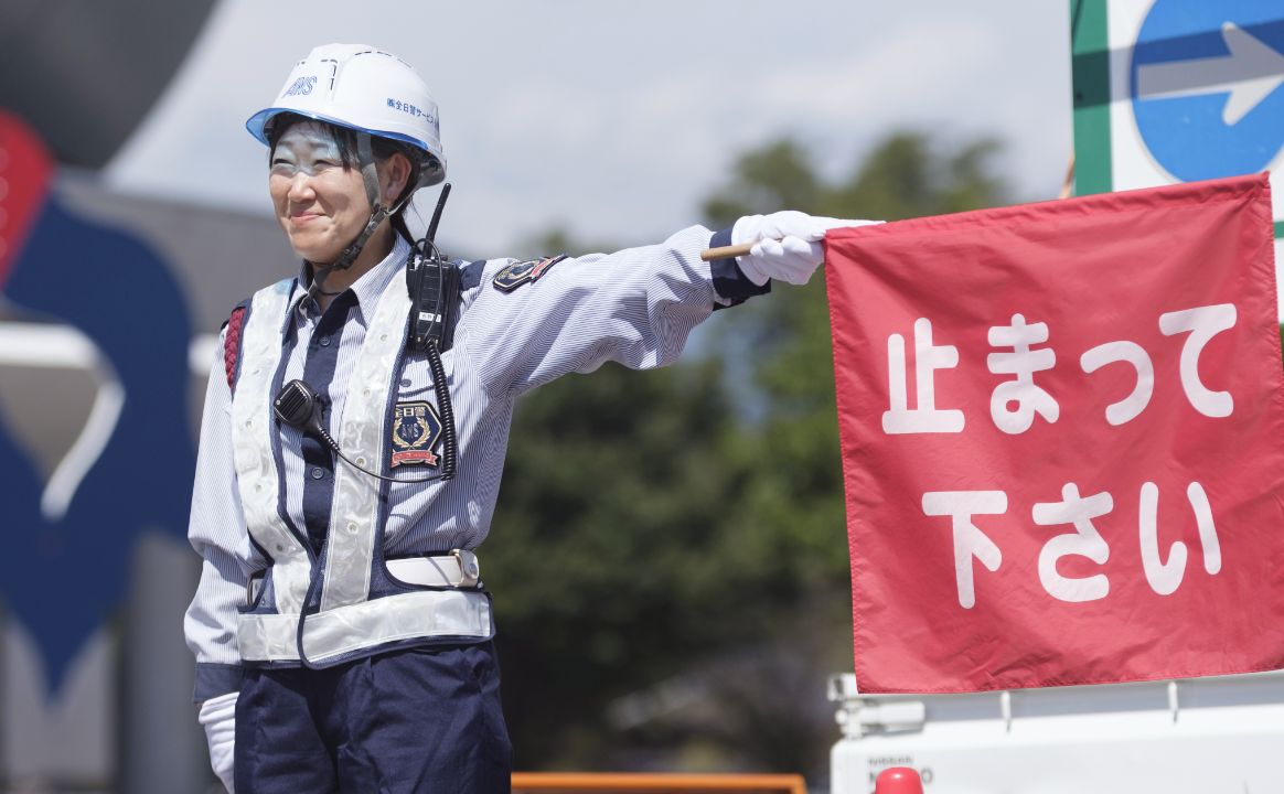 ときには何十人もの警備員が連携し、通行人や車両の安全を守ります。
